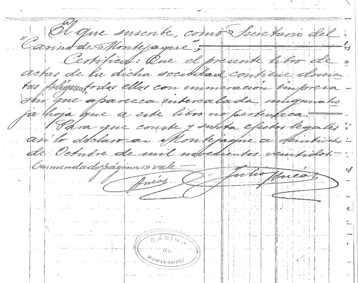 Hace aproximadamente un año Zunifredo García Vázquez me hizo llegar unas copias del Libro de Actas del antiguo Casino de Montejaque a fin de que se le diera la difusión suficiente y merecida de esta sociedad creada hace ahora 99 años.