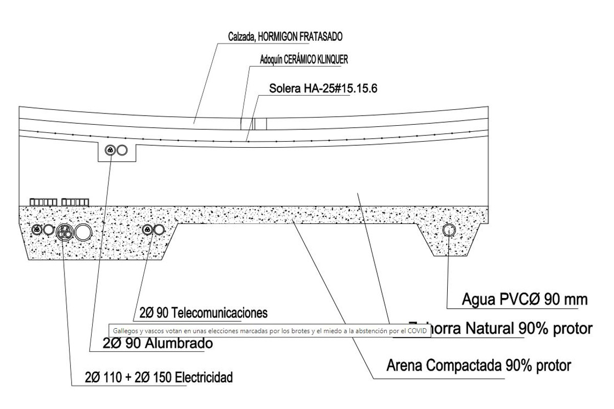 Remodelación del pavimento actual, sustituyendo el hormigón por una terminación en hormigón fratasado tratado con espigas de adoquín cerámico, así como una perfecta definición de las zonas peatonales con las de tráfico rodado.